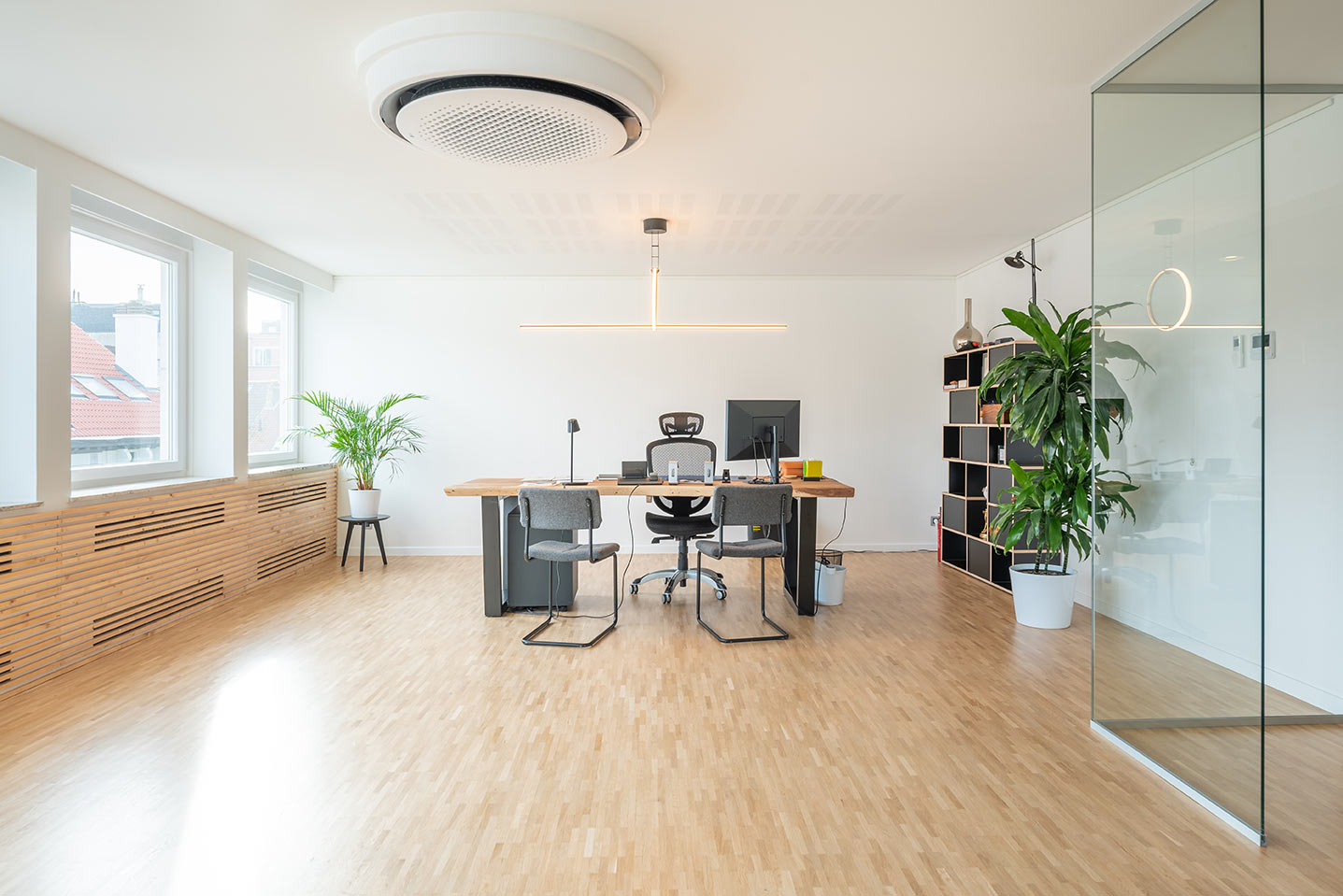 Een bedrijf gespecialiseerd in duurzame brandstof voor kachels vestigde zich in een gerenoveerd gebouw in het centrum van Brussel. Vooraleer het als kantoorruimte in gebruik werd genomen, besloten ze eerst verschillende aanpassingen te doen. Zo gingen de nieuwe eigenaars op zoek naar een HVAC-systeem dat krachtig genoeg is om het hele kantoor snel en efficiënt af te koelen, niet alleen om in aangename omstandigheden te kunnen werken, maar ook om klanten en partners in alle comfort te kunnen ontvangen.