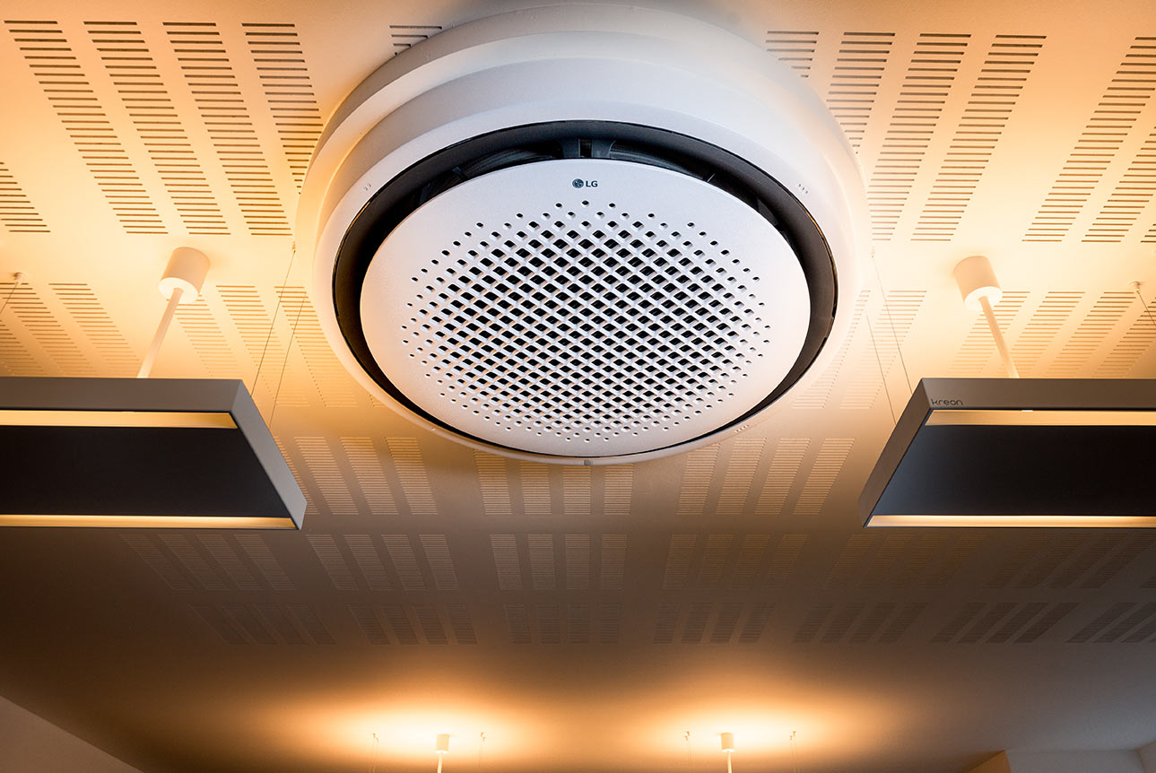 In samenspraak met installateur BelAir&Co en de architecte, koos het bedrijf voor de LG Round Flow Cassette gekoppeld aan de Multi V S buitenunit. Er werden twee binnentoestellen met een vermogen van 10 kW geplaatst die ideaal zijn voor ruimtes als cafés, retail, hotels én kantoren. Het buitentoestel kreeg een plekje in de buurt van de noodtrap op de vijfde verdieping waar het geen hinder veroorzaakt. “Dit bedrijf was op zoek naar een koeling met een discreet binnentoestel”, zegt Virya De Croock van BelAir&Co. “Het vals plafond was maar 20 cm diep en daardoor was het niet evident om een systeem te plaatsen dat naadloos in het interieur opgaat. Toen ze het strakke en aparte design van de LG Round Flow Cassette zagen, waren ze snel overtuigd. De apparaten zijn vrij eenvoudig te plaatsen en we wisten de installatie in een week tijd af te ronden. De buitenunit van de Multi V S is erg compact. Dat vereenvoudigde de plaatsing en maakte het mogelijk om die helemaal op het vijfde verdiep te plaatsen. We hebben alles vooraf grondig getest en daarna kon het kantoor probleemloos in gebruik genomen worden. De feedback die we kregen was bijzonder positief.”