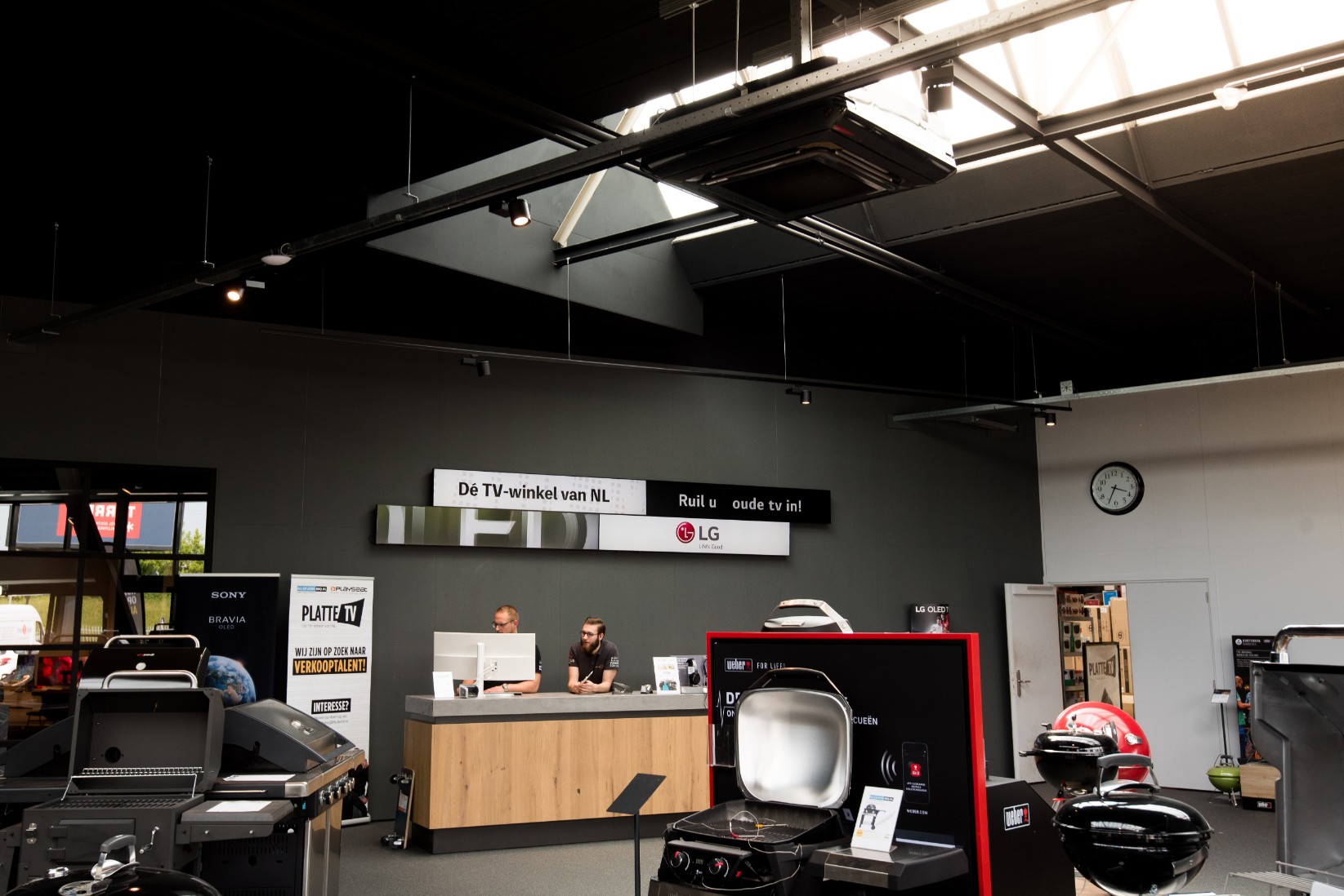 Platte TV, de specialist in Televisie en Audio, heeft onlangs het bedrijfspand in Amsterdam grondig gerenoveerd en omgetoverd tot een fraai ogende elektronica zaak. In het pand, dat een bruto vloeroppervlak beslaat van duizend vierkante meter, worden televisies, audioapparatuur, outdoor keukens en barbecues verkocht. Voor met name het koelen van de winkelruimte ging de voorkeur uit naar een energiezuinige oplossing waarbij het comfort voor de bezoeker voorop stond. In samenspraak met installateur Koelplan uit Zaandam is het perfecte binnenklimaat gerealiseerd door het plaatsen van negen LG 4-weg High Inverter cassette units, waardoor klanten nu tijdens warme dagen bij een aangename temperatuur hun potentiële nieuwe aankopen kunnen bewonderen.