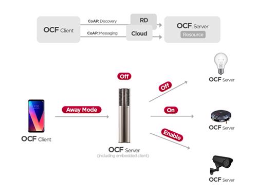 OCF fonctionne comme un modèle de serveur client. Chaque serveur peut fournir ses propres moyens de service IoT. Le serveur HVAC OCF par exemple, dispose d’un set bien défini de fonctionnalités HVAC, telles qu’« Allumé », « Éteint », « Régler la Température » et « Vitesse de ventilation ».