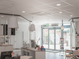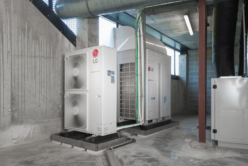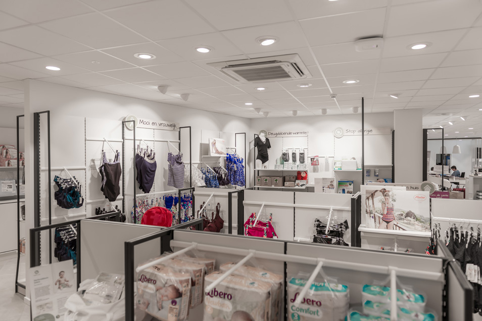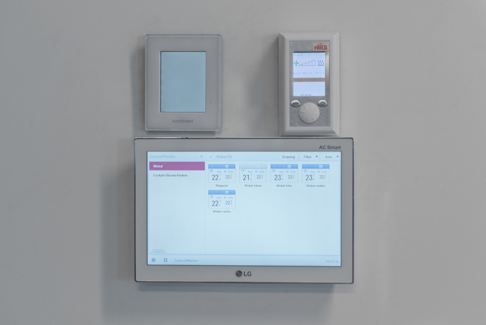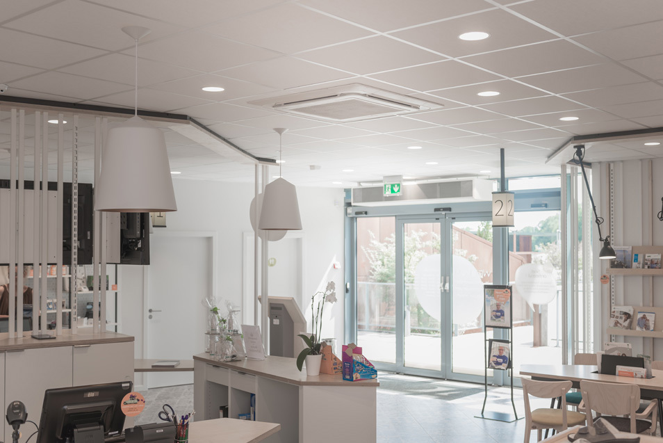 On a opté pour la production d’une pompe à chaleur LG Multi V de 56 kW avec plusieurs cassettes à 4 voies et des unités consoles pour les espaces de consultation. Un rideau d’air à expansion directe permet une solution économique et maintient la chaleur à l’intérieur en hiver. En été, le rideau d’air fait office de barrière d’air entre le magasin climatisé et l’extérieur. L’installation Multi V refroidit ou chauffe le magasin et les divers espaces de consultation. L’installation Multi V Plus est programmée par une commande centrale AC Smart de sorte qu’il fait toujours agréable dans les divers espaces.