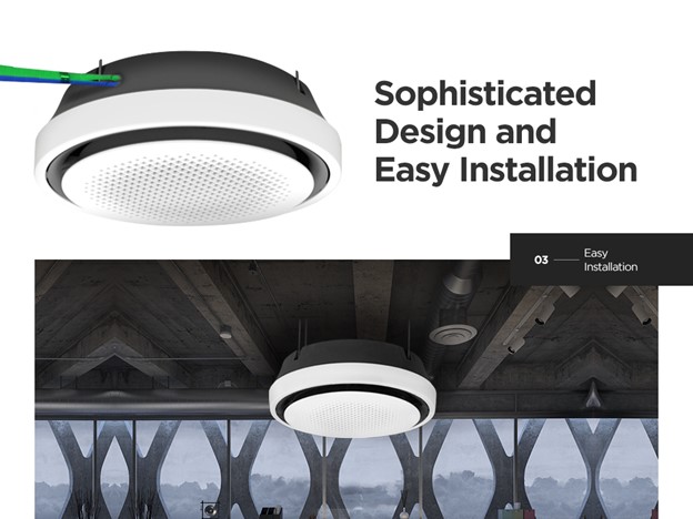 Door de hoogte van het product te verkleinen, zorgt de round cassette voor meer openheid van een ruimte na installatie. De hoogte is slechts 33 cm. Bovendien bevinden de aansluitingen voor de condensafvoer en de koudemiddelleidingen zich op één plaats op de unit om de zichtbaarheid van leidingen en componenten te minimaliseren. Tevens zorgt het voor installatiegemak van de installateur. Dit premium ontwerp is perfect geschikt voor trendy en luxe ruimtes zoals hotels, restaurants, kantoor, cafés, musea en high-end meubel- en kledingwinkels.