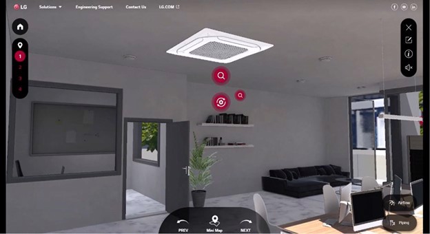 Het nieuwe virtuele platform van LG werd gecreëerd om klanten en professionals op een eenvoudige manier een kijk te geven op verschillende installaties en producten die elke omgeving optimaliseren. Bezoekers kunnen uit verschillende mogelijkheden, zoals appartement, villa, kantoor, high level kantoor, retail en hotel (verdere updates volgen) kiezen, en de virtuele rondleiding volgen met hun PC's of mobiele devices. Door op een categorie te klikken, kunnen gebruikers vrij elke installatieruimte doorlopen en gedetailleerde informatie terugvinden over elk onderdeel van de installatie, zoals de specificaties, kenmerken, productvideo's en casestudies. Door op de knoppen ‘luchtstroom’ en ‘leidingwerk’ te klikken, krijgen bezoekers een duidelijk beeld van de luchtstroom van elke binnen-unit of luchtreiniger. Ze krijgen ook te zien welke weg water en koelmiddel afleggen in het leidingwerk. Ze kunnen zelfs navigeren tussen verschillende operationele modi om te zien hoe de luchtstroom verandert.