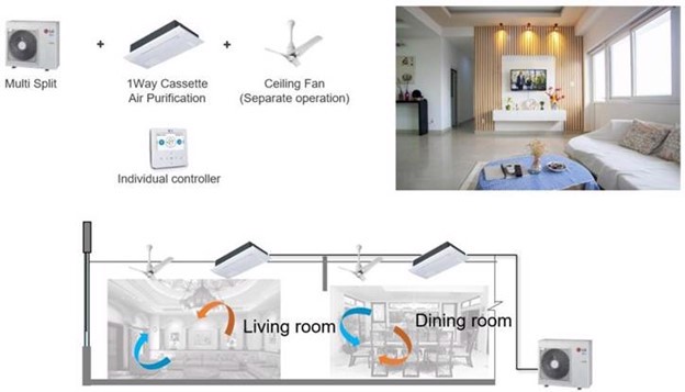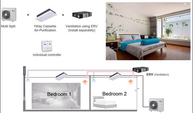 Voor eet- en woonkamers zijn de Multi Split met 1-weg cassette, een luchtzuiveringsset en een plafondventilator een goede combinatie. Voor slaapkamers is het toevoegen van een Energy Recovery Ventilator (ERV), in plaats van een plafondventilator, goed voor veel frisse lucht en een goede, stille nachtrust.