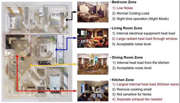 Bij de start van een traject worden de eigenschappen van de woningen in kaart gebracht en dient het doel van de ontwikkelaar achterhaald te worden. Zoals te zien in de onderstaande afbeelding, zijn de woonkamer, de badkamer en de keuken de drie belangrijkste ruimtes van een woning. Elke ruimte heeft eigen, verschillende HVAC-vereisten. Tegelijkertijd kan de klant ook eigen wensen of behoeften hebben. De projectontwikkelaar is verantwoordelijk voor de bouw en haalt zijn winst uit de verkoop en/of verhuur. Als het gebouw aan de wensen van de klant voldoet, wordt op die manier de waarde van het gebouw hoger. Een optimaal voorstel levert uiteindelijk een verhoogde waarde op.