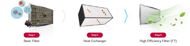 Deze efficiënte en effectieve luchtventilatie-oplossingen verwijderen door middel van een 3-staps zuiveringssysteem de schadelijke allergenen uit de lucht. Filters aan de voor- en achterkant van de warmtewisselaar zorgen ervoor dat de lucht die in en uit de warmtewisselaar stroomt grondig gefilterd wordt. Daarnaast houdt de antiviruscoating op de warmtewisselaar de componenten vrij van virussen en bacteriën, terwijl extra hoogrenderende filters 80 tot 90% van het microstof tot 0,4μm blokkeren. Dit intensieve zuiveringssysteem is de kern van de LG ERV-oplossingen.