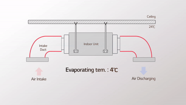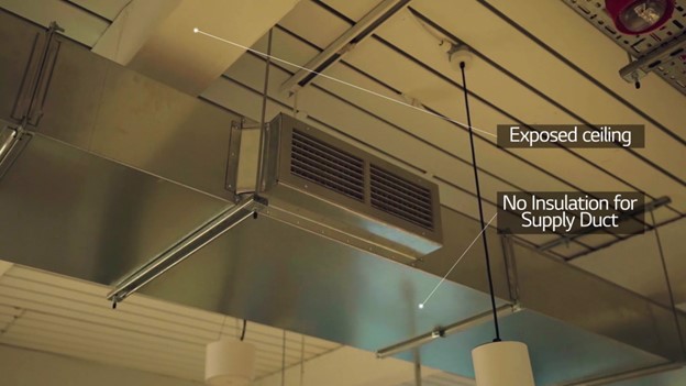 Een andere uitdaging van de installatie was de zichtbare plafondconstructie van het gebouw zelf. Om condensvorming op de luchtschachten te voorkomen, was daarom een uitblaastemperatuur van 12ºC of hoger vereist. Normaal gesproken worden binnen units geproduceerd met een verdampingstemperatuur van 4ºC, wat resulteert in een uitblaastemperatuur van ongeveer 10ºC tot 11ºC. Om de benodigde uitblaastemperatuur van 12ºC te realiseren, heeft LG daarom een op maat gemaakte ventilatorspoel ontwikkeld. Met deze speciale ventilatorspoel kan een verdampingstemperatuur van 9ºC behaald worden en een uitblaastemperatuur van 12ºC tot 14ºC.